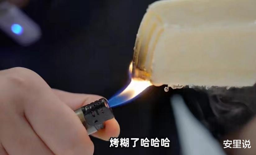 可让人感到惊讶的是,被火烧过的钟薛高不仅没融化,反而还在冒烟,发出噼噼啪啪的响声,感觉这不是在烤雪糕,这是在烧什么塑性物。