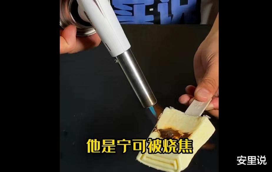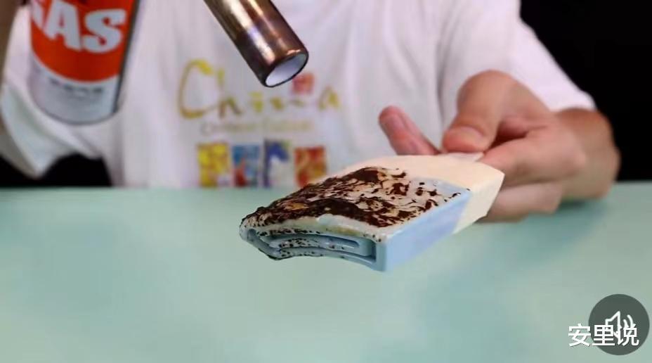 接着有博主拿出了杀手锏之喷枪,这可是最高温度能达到1500℃的喷枪啊,就这超高温的喷枪依旧无法“打开”这款雪糕的“心”。