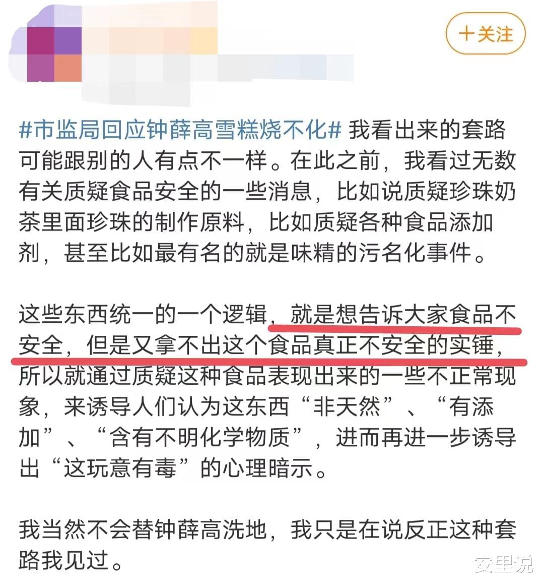 但也有知名大V认为,网上各种质疑钟薛高产品有问题,又拿不出指向这个食品真正不安全的实锤和证据的,说到底是一起污名化事件。