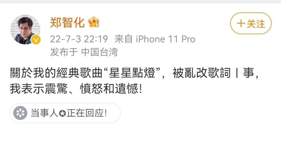 事件的导火索,便是原唱及词曲作者郑智化得知歌词被乱改后的发文。这位曾因《水手》《星星点灯》《老幺的故事》等经典作品叱咤上世纪90年代流行乐坛的音乐人,在微博上表示“震惊、愤怒和遗憾”。