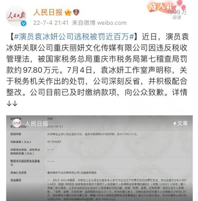 事发后袁冰妍工作室也发布道歉声明,称已及时缴清罚款,表示深刻反省,以后一定严格依法纳税,按规定及时履行相关业务。