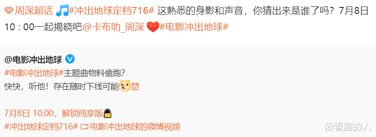 周深的两首新歌都是提前让大家猜出来的啊,他为《苍兰诀》献唱的主题曲《余情》让人听了痴迷,虽然只有短短的一小段,就能让人无数遍循环,而为电影《冲出地球》释放的物料只有音乐,还是挺神秘的,不过看到身影就能知道是周深,期待起来吧。