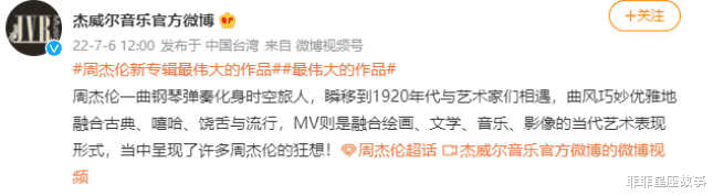 而且这还仅仅只是他官方微博这一个平台,不算B站和QQ音乐等联合平台。B站在十二点五分的时候发了一条微博说有十万人正在线上同时收看周杰伦新歌MV。