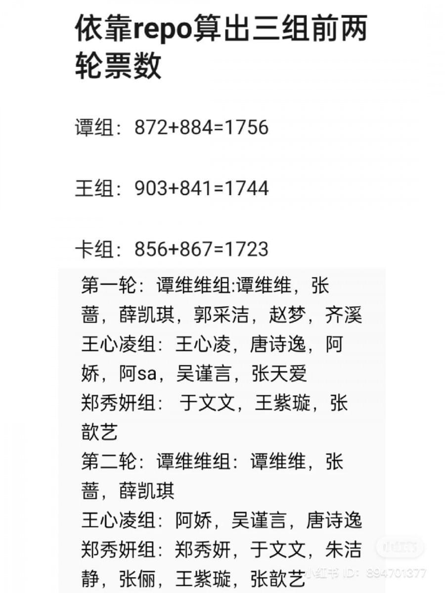 谭维维在五公三轮全部都有参与,根据网友爆料单看五公前两轮的总分就知道「谭维维」组以 1756 票数领先第 1 ,王心凌组的票数则是 1744 位居第二,最后一名则是 Jessica 1723 。