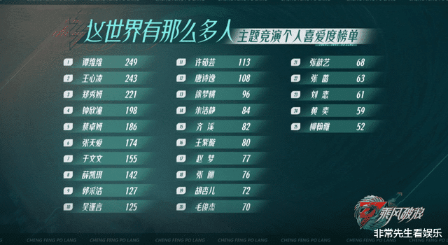 在前三次公演后的个人喜爱度排名中,前三名都是谭维维、王心凌和郑秀妍,仅有微小变动,所以她们仨基本是锁定上位区的。