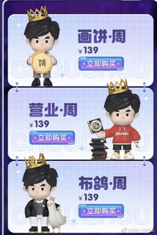 这一次的手办很贴合周杰伦本人,手办一共三款,其中画饼.周与布鸽.周都是在调侃周杰伦这两年的操作,原来周杰伦自己也知道自己是画饼大王和鸽王。