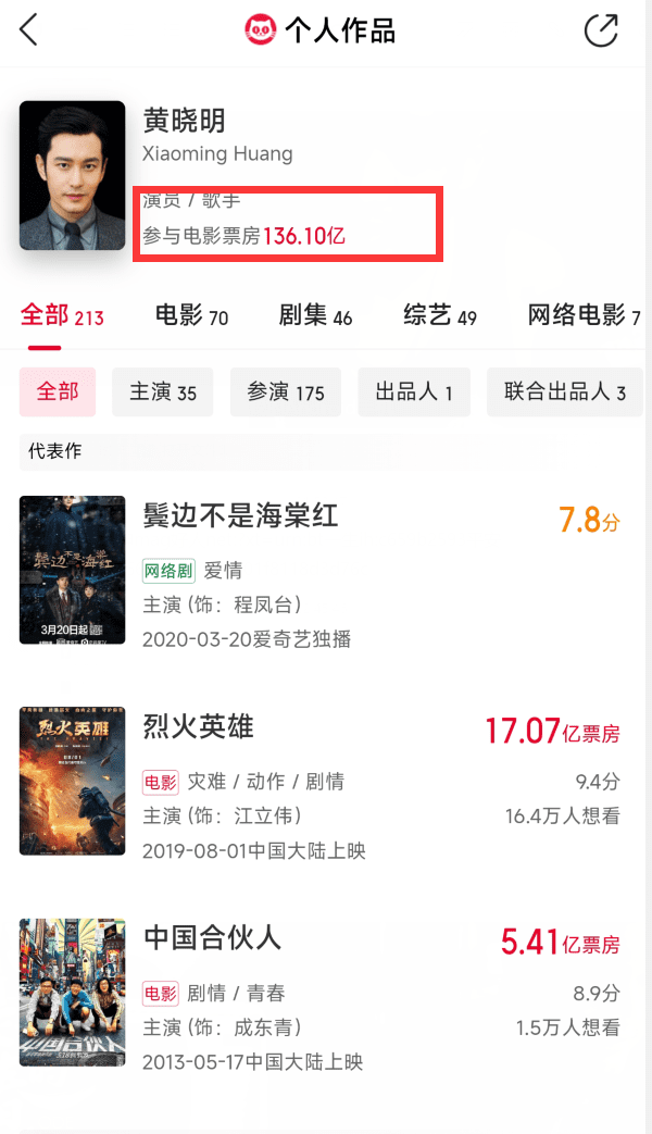黄晓明虽然是毕竟早进入百亿票房俱乐部的,但真正扛票房的只有《烈火英雄》的17亿票房,像出演的《八佰》《叶问》系列,黄晓明都不是主演,这136亿票房很多都是蹭来的