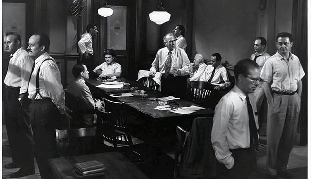 其中一个打破二维空间的重要手法就是纵深调度,换句话说,就是利用空间的景深以及其变化进行调度。这里我们可以尝试枚举一下《十二怒汉》的导演具体用了哪些纵深调度手法来完成影片叙事的,例如,前后景同时叙事、调度改变景别、重心人物转换、人物调度引导叙事区域转变、调度转换视点等等。