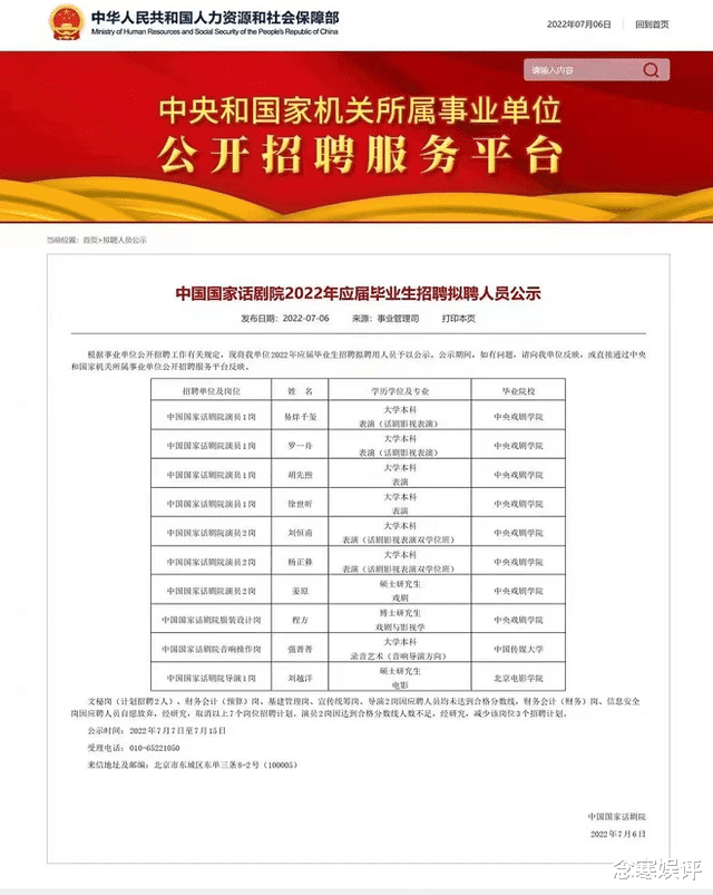 不过需要强调的是,国家话剧院可不是一般的事业单位,要比考北京人民艺术剧院难多了,主要是门槛高、难度大,一般的演员根本就进不去,而且还得是全国顶尖的学校才能去报考,这也就能够理解今年被招聘进去的应届毕业生,基本上都是中央戏剧学院、中国传媒大学和北京电影学院毕业的。