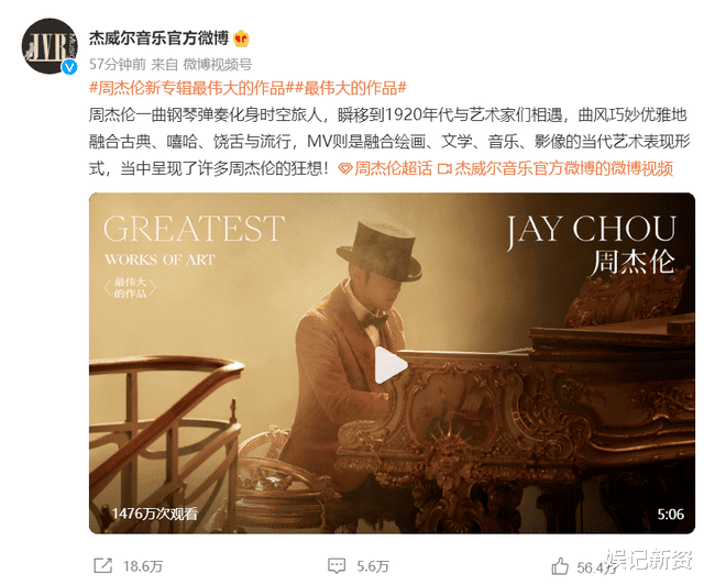 中午十二点,周杰伦的新专辑《最伟大的作品》先行曲MV准时上线。其经纪公司也第一时间在微博晒出了周杰伦的新专辑,并配文周杰伦一曲钢琴弹奏化身时空旅人,瞬移到1920年代与艺术家们相遇。还提到其中呈现了许多周杰伦的狂想!