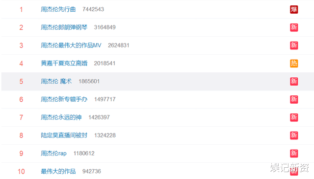 从评论都不难看出网友们对于周杰伦作品的喜欢,而最能反映这一点的就是热搜榜单,才上线没多久,周杰伦新专辑的消息就已经霸榜,放眼望去一半以上都是和周杰伦先行曲有过的,最夸张的是热搜前五都是周杰伦,这也太厉害了,堪称“周榜”。