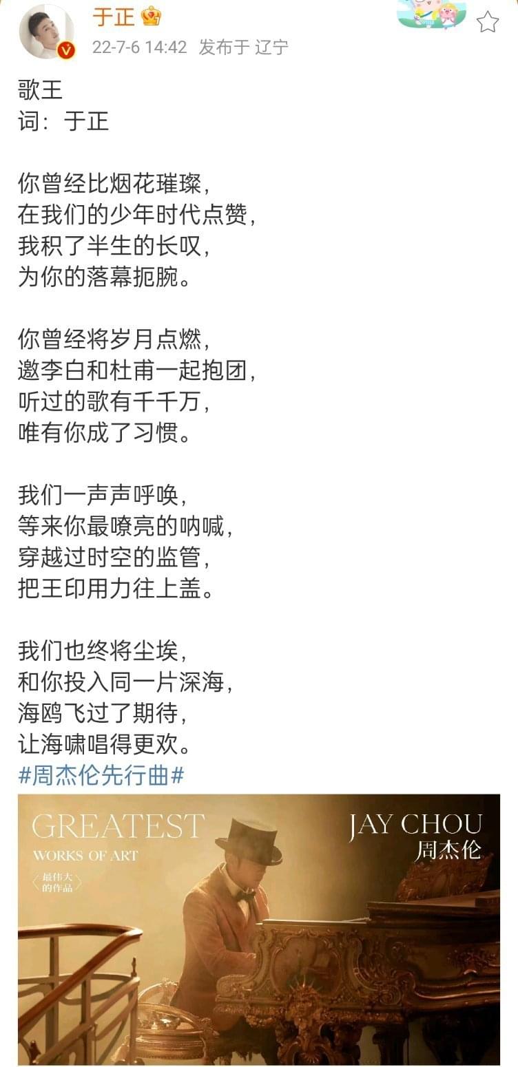 7月5日,于正真的蹭到了,掌握了流量密码,周杰伦发新歌,他写歌词《歌王》致敬,从歌词里感受到了于正对周杰伦的喜欢,“听过的歌千千万,唯有你成了习惯”,被网友质疑还直接正面回应就是蹭,“这次是真的蹭,主要是太喜欢周杰伦的歌了”,果然男女老少都躲不过周杰伦!