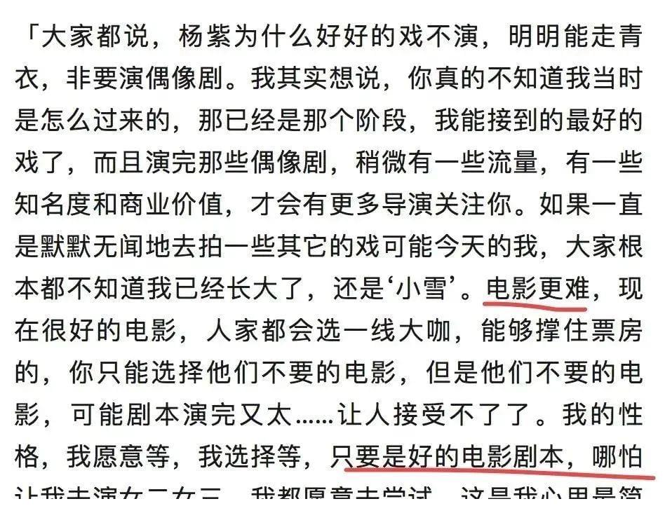 杨紫一直在寻找流量和演技之间的平衡:“演完一些偶像剧,有一些流量,有一些知名度和商业价值,才会有更多的导演关注你。”她不是放弃正剧,去走流量路线,而是在已有资源中挑选最有利的去演。