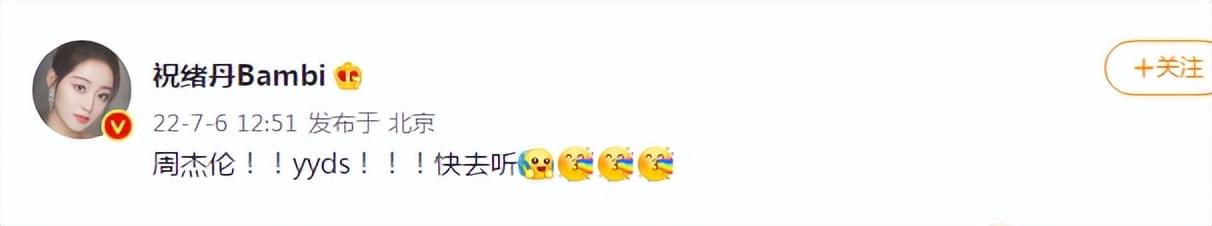 蒋梦婕说:“太激动了,不知道该说啥,啊啊啊,终于等来了。”祝绪丹则说:“周杰伦,YYDS,快去听。”