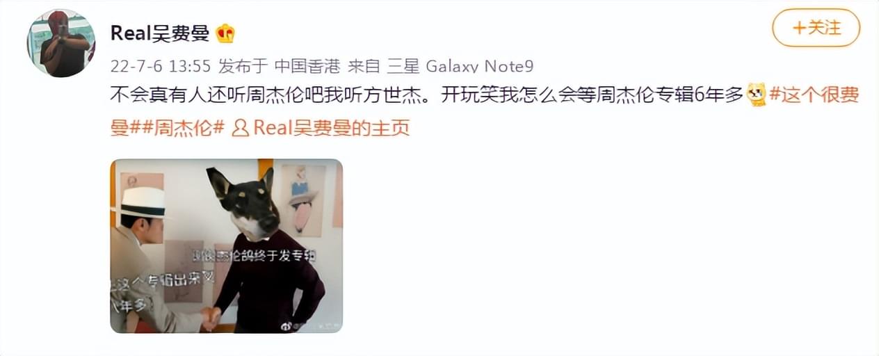 吴镇宇的儿子吴费曼说:“不会真有人还听周杰伦吧?我听方世杰!开玩笑,我怎么会等周杰伦专辑6年多?”方世杰是周杰伦主演电影《大灌篮》里的人物,由周杰伦扮演。