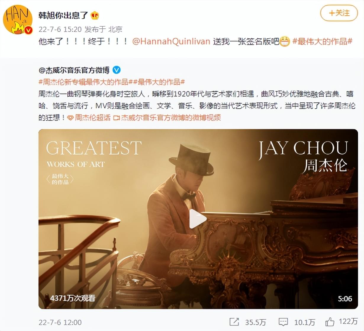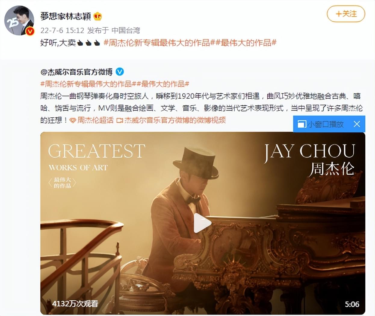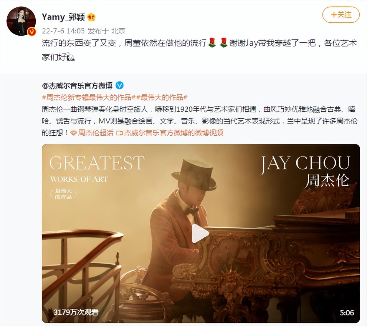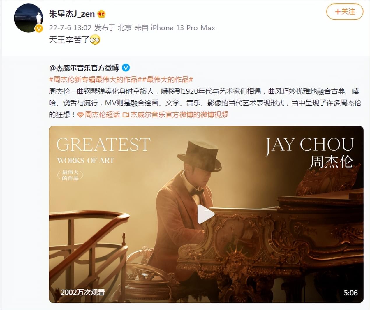 看点:2022年7月6日中午12点,周杰伦新专辑《最伟大的作品》同名歌曲MV公开,很多明星发微博为其打call,我们来看看都有谁。