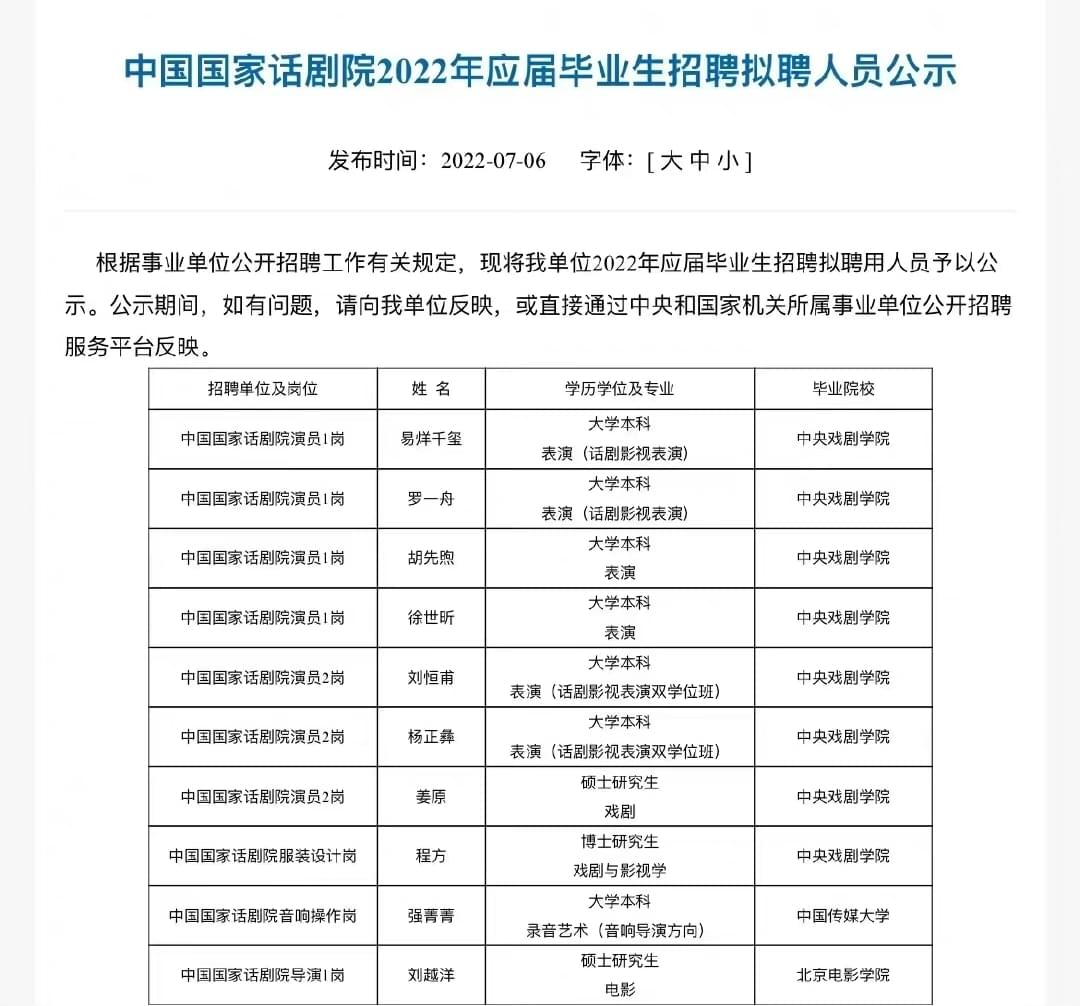 7月6日,据中国国家话剧院官网所公布的2022年应届毕业生招聘拟聘人员公示名单中可以得知,易烊千玺、罗一舟、胡先煦三人均考入演员1岗的位置,一时间登上热搜,并收获无数网友们的祝福。