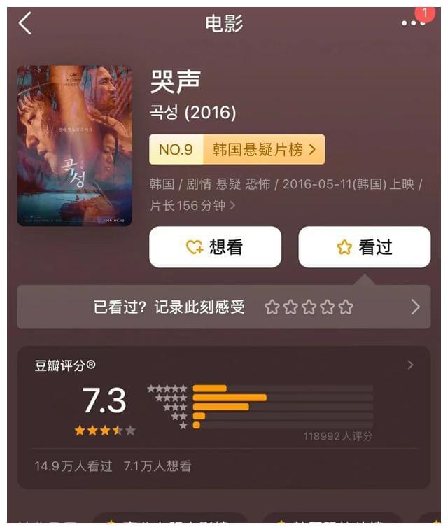 哭声|又爽又懵逼的韩国高分惊悚悬疑片哭声(2016)豆瓣7.3分推荐指数故事简介:韩国的一个村庄发生了一系列残暴而难以解释的神秘谋杀,死亡仿佛会随机降落到某个村民身上。一名年老的日本人刚刚搬到村边树林里隐居,一时间,村内谣言四起。警察面对系列谋杀毫无头绪,既找不到凶手,也没有合理的解释。这部片两个多小时都是惊悚恐怖的氛围,但是看完给我的感觉就是又爽又懵逼!这部电影通过不同的视角来阐释同一件事,但是真相却无法揭开。因为谁都有自己的真诚,谁也都有自己的虚伪,人性的复杂导致了叙述的多元,而真相恐怕只有上帝知道。所以恶魔究竟是谁?是因为传染病引发的癔症、神棍的装神弄鬼、三人成虎的传言,让村里人笼罩在恐怖之中?还是由于村里人的歧视、偏见和污蔑最终将日本人造就成了恶魔?亦或是恶魔一直都在,只是之前隐藏在暗处,最后附身在已死的日本人身上?日本人施法究竟是为了救人,还是为了制造僵尸?——这无疑是故事主线中始终在寻求和论证的问题。女鬼是谁?有什么背景?——一直没有交代,或许首先需要弄清楚她的所作所为,才能进行推断。女鬼有什么目的?女鬼是在帮钟九,还是幕后的恶魔?——女鬼跟日本人的对立关系非常明显,所以她的动机非常重要。除此之外,还有更多地方设置了悬念,例如日本人为什么来这个村子?日本人强暴妇女的传言是怎么回事?钟九所作的噩梦只是噩梦还是被故意施法产生的幻觉?施法的黑鸡与白鸡、日本人和女鬼追逐中分别穿的黑衣与白衣是否意味着什么?这部片子还有两个值得一提的地方。一个是父女亲情伦理关系在恶魔入侵后的破坏和扭曲,还有一个就是韩国巫师和日本人同时做法,男主人公的女儿在交错的法术折磨中痛不欲生地挣扎,那急促的鼓点声和各种鬼魅的舞蹈动作,加之各种光影的交错,委实叫人心惊胆战,难受不已。心里只有一个渴望:快TM让这一切结束吧,太折磨了!以上三部高分电影你喜欢哪部,欢迎留言讨论!!!