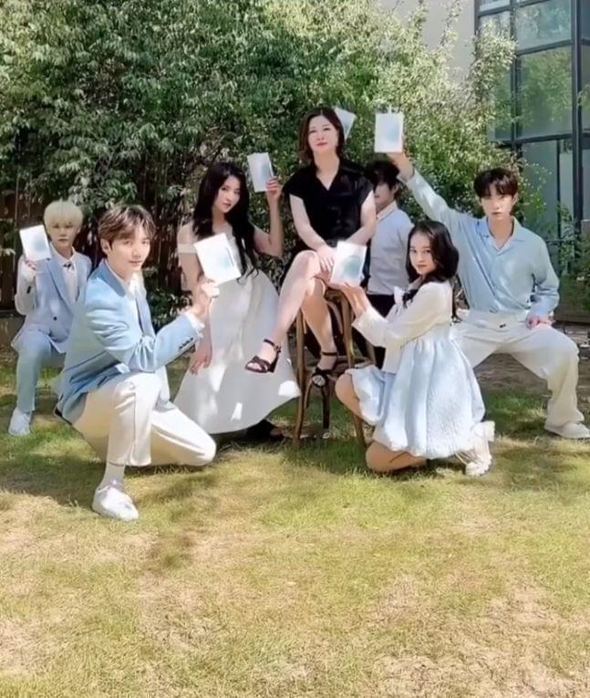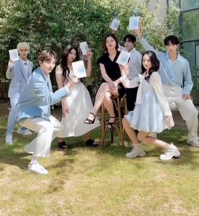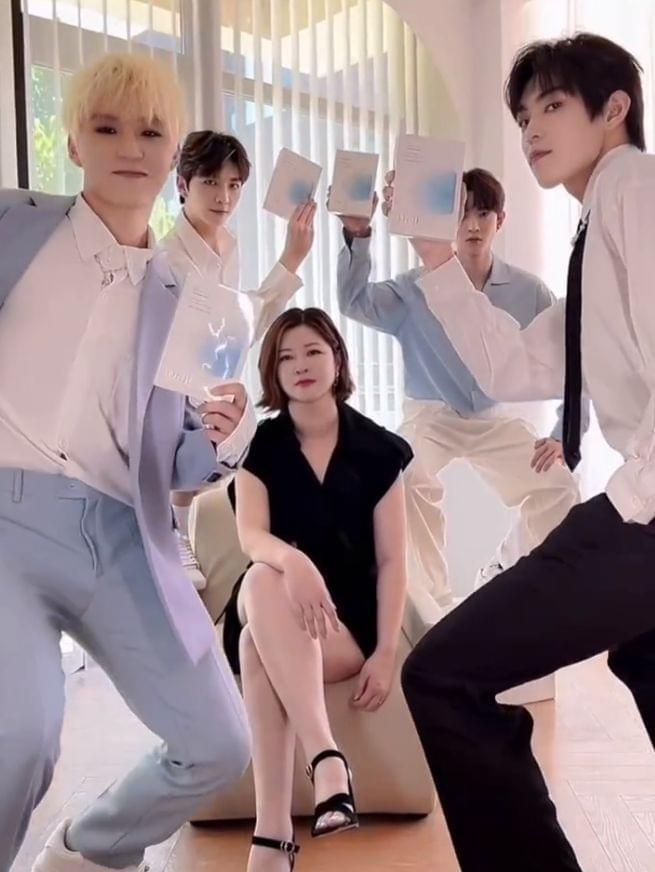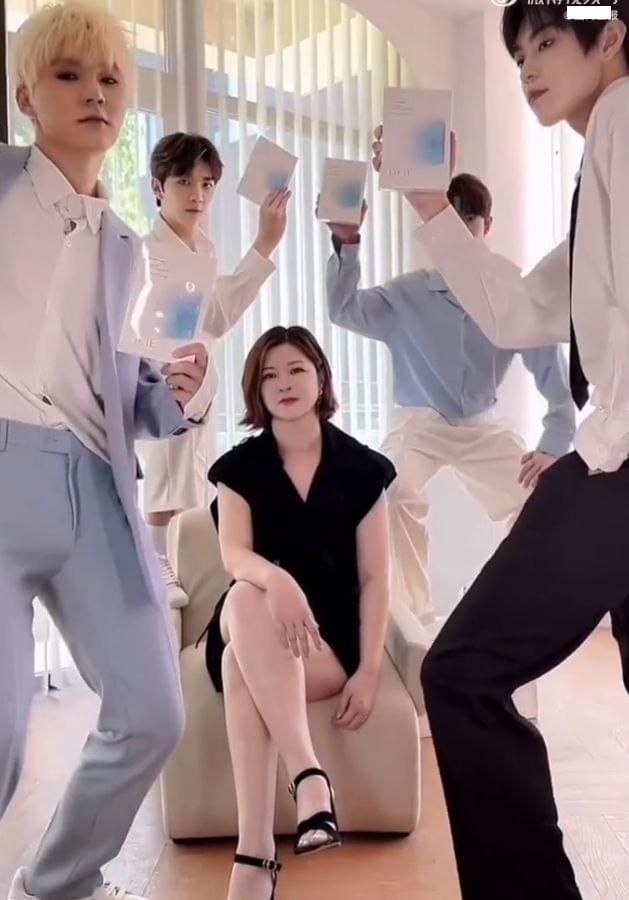 从画面中可以看到,杜华坐在C位,她身穿黑色短裙,翘着二郎腿坐在凳子上,几位年轻爱豆一人拿着一盒面膜对着镜头展示,而杜华则是面无表情,十分淡定。