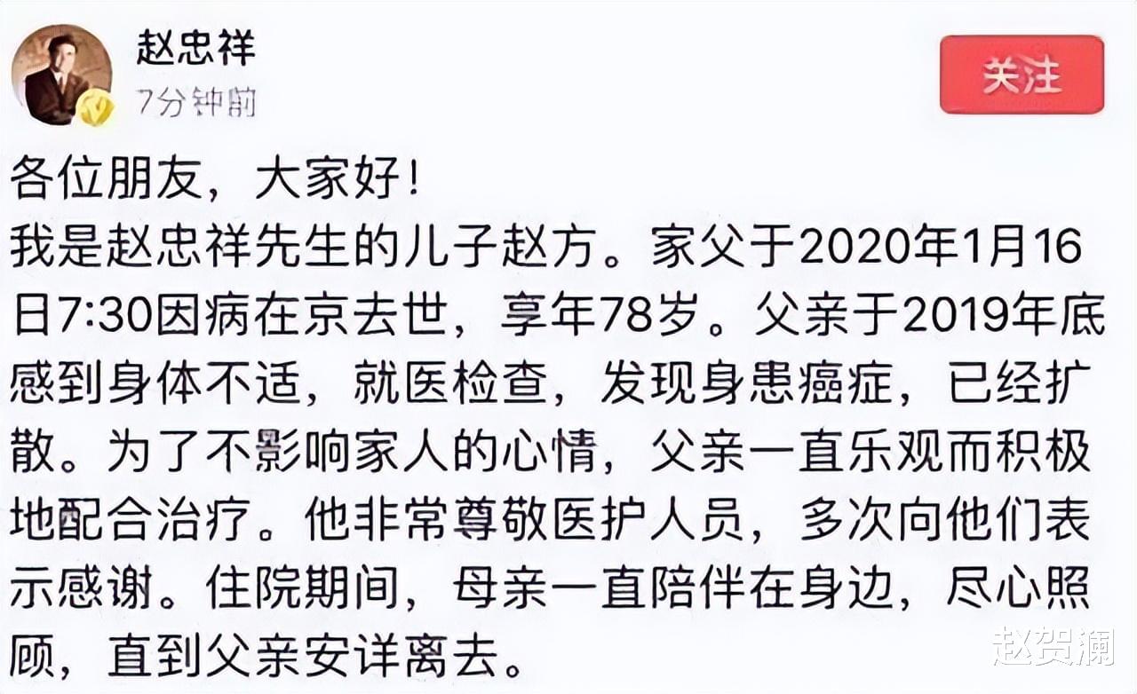 从赵方在网上发的讣告来看,赵忠祥在2019年底感到身体不适去医院检查,一查居然是癌症!