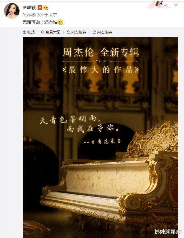 张靓颖则是直接写出了周董粉丝的感觉:“无话可说!还有谁”。