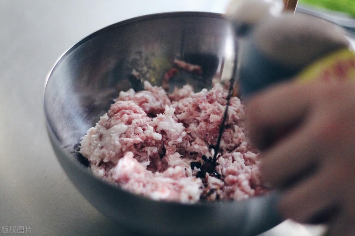 2、把荠菜、肉末、生抽、蚝油、少许盐、适量料酒、糖一起搅拌,边搅边加入少许水,搅匀上劲。搅好拌料把饺子包好。
