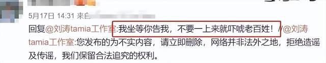刘涛工作室针对此事迅速转发辟谣,但该网友却仍然坚持自己的说法,硬气回复道:“我坐等你告我。”