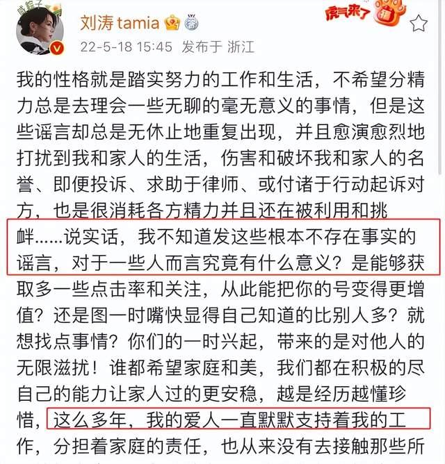 刘涛随后发长文辟谣,说这么多年王珂一直默默支持着她的工作,否定了离婚这一说法。