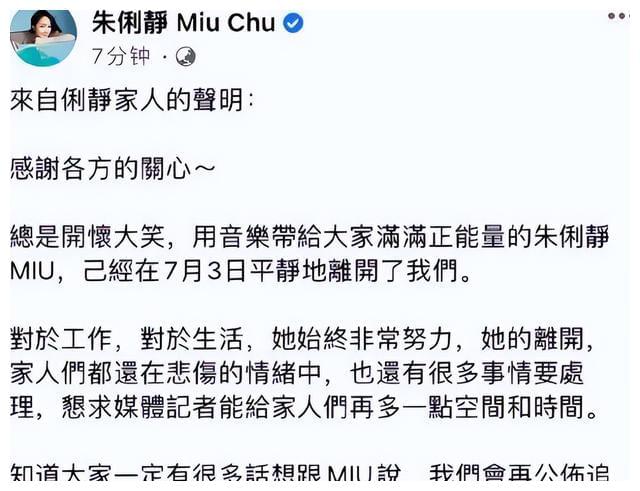目前,他已经完全康复,而且还没有后遗症。作为粉丝,也希望能尽快地在荧幕上看见他给大家带来精彩的电影。四、歌手朱俐静去世在7月4日,娱乐圈再传噩耗,中国台湾知名歌手朱俐静患乳腺癌去世,在7月3日去世,年仅40岁,她的家人们目前还沉浸在悲痛中。