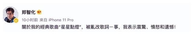 歌词中“是肮脏的一片天,星星在文明的天空里再也看不见”变成“是晴朗的一片天,总是看得见”。对此,郑智化发文回应表示:“关于我的经典歌曲《星星点灯》被乱改歌词一事,我表示震惊、愤怒和遗憾”。