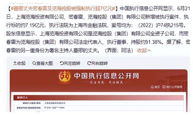 对于恋情的传闻,无论是井柏然还是刘雯都未做出过任何回应,似乎是想要将悬念进行到底!七、董卿丈夫密春雷被执行超7亿央视知名主持人董卿的丈夫密春雷已经失恋了半年之久,关于他的去向无人知晓。近日,网上爆出一则消息,董卿富豪老公密春雷及其览海控股被强制执行超过7亿元,在中国执行信息公开网中可以看到这起案件。