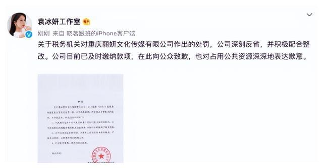 在消息爆出后,袁冰妍工作室声明称,关于税务机关作出的处罚,公司深刻反省,并积极配合整改。公司目前已及时缴纳款项,向公众致歉。而袁冰妍本人并未就此做出任何的表示。