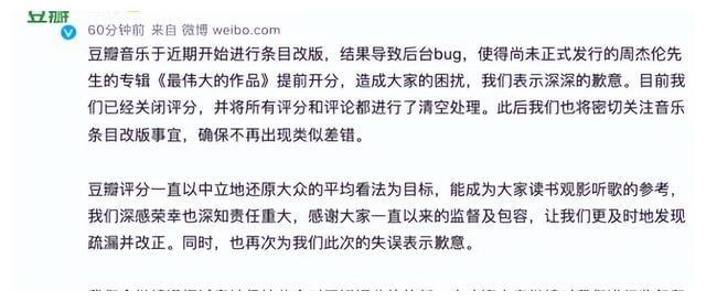 在引发争议后,豆瓣官方账号发文,为周杰伦专辑《最伟大的作品》提前开分道歉,将责任甩给了程序员。因豆瓣音乐于近期开始进行条目改版,结果导致后台bug,后续将不会出现这样的问题。