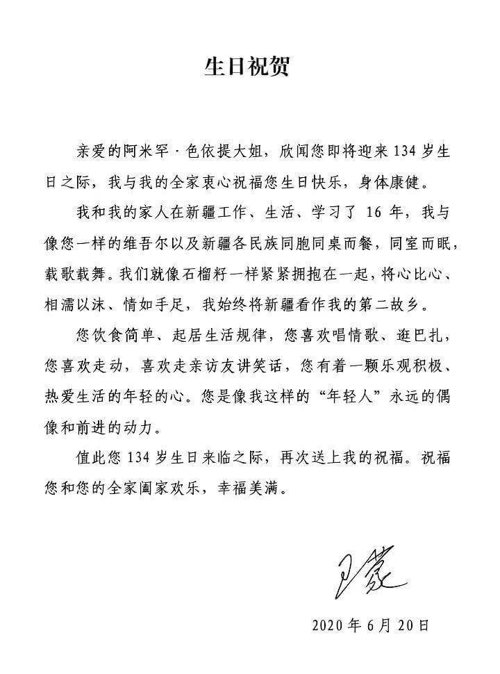 在她134岁生日之际,著名作家王蒙特意发去《生日祝福》:亲爱的阿丽米罕色依提大姐,欣闻您即将迎来134岁生日之际,我与我的全家衷心祝福您生日快乐,身体健康。