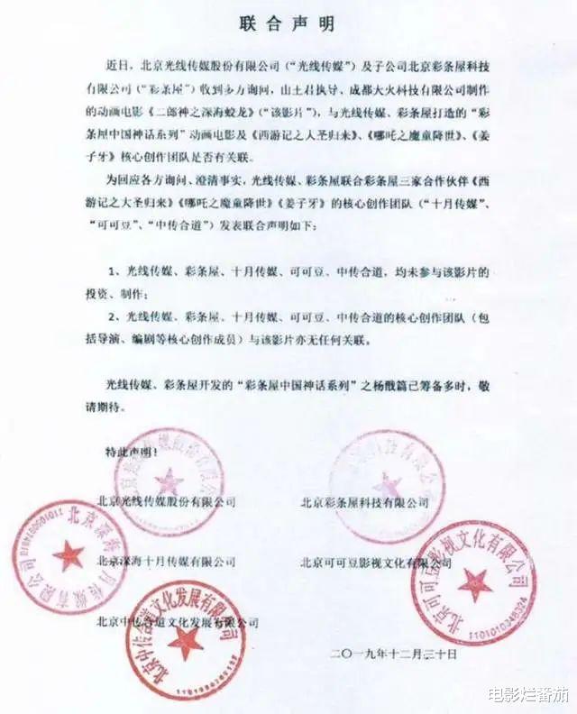 这部《深海蛟龙》取名《二郎神》,不得不让人怀疑有“碰瓷”之嫌,彩条屋和光线也曾因为它专门发了声明,声明中称,这部片子与自己半毛关系都没有。