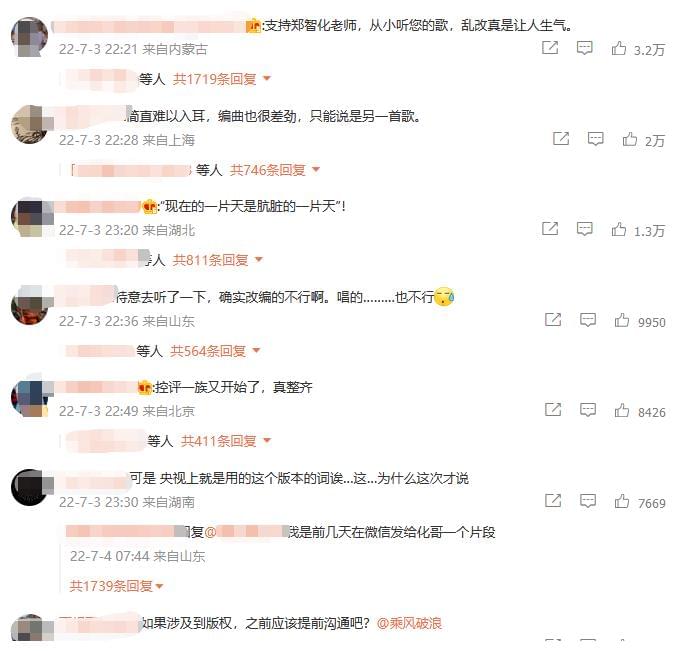 郑智化微博评论区也众说纷纭。有支持维权的,也有质疑央视也曾使用改编版本的。