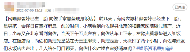 #向佐现身饭店#、#向佐为郭碧婷买靠垫#、#网传郭碧婷二胎生子#