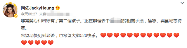 第二天,向佐也官宣了这一消息,他的发文十分暖心,更表示“希望尽快见到老婆”。