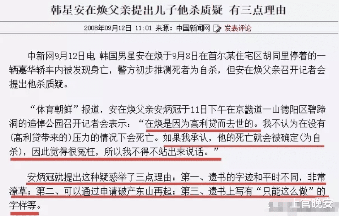 但根据韩国警方的调查,安在焕属于自杀,原因大概是因为创业失败资金紧张,导致的心理和精神压力过大,后来还借了高利贷无力偿还,最终走上了自杀的绝路。