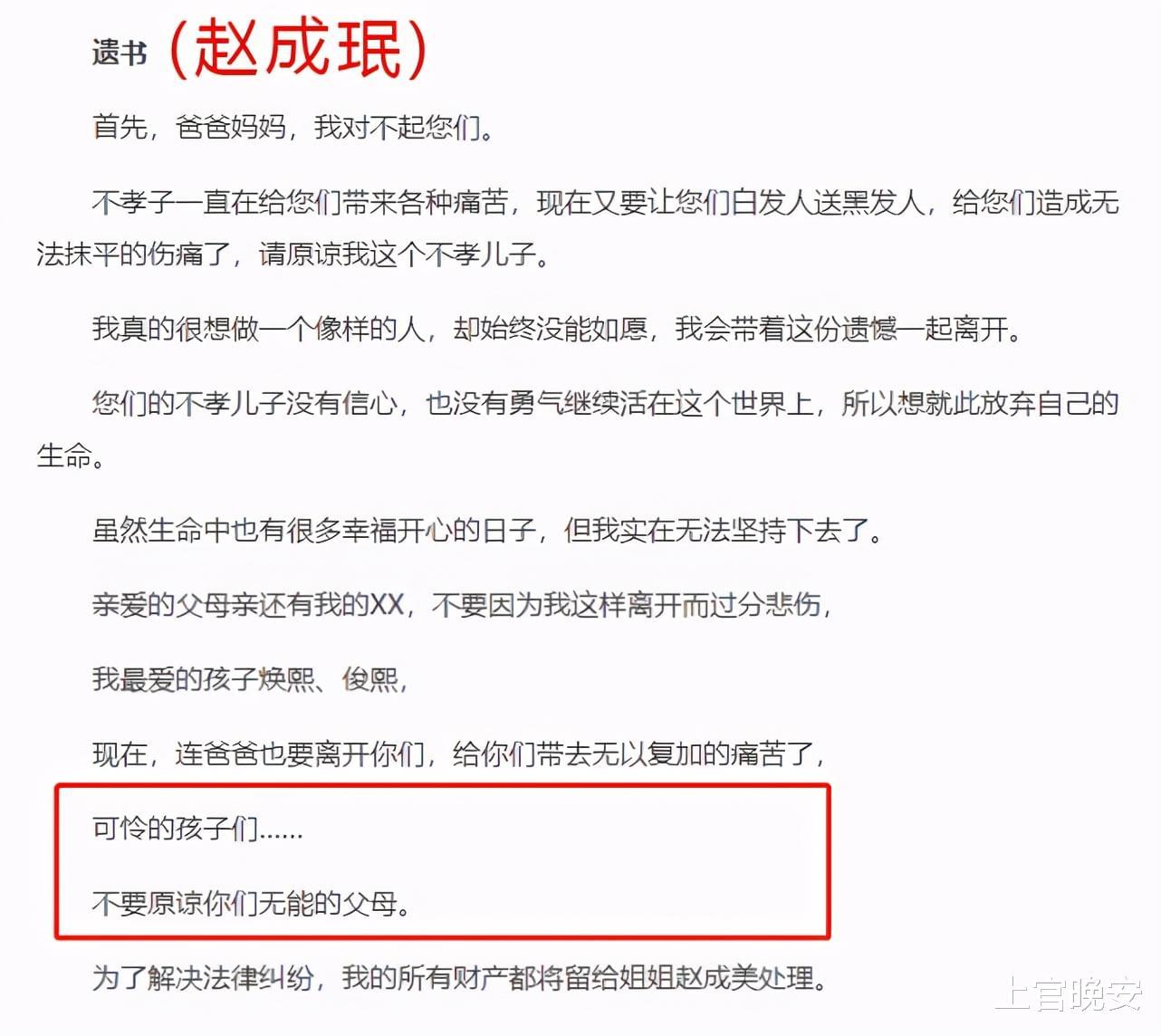 在赵成珉遗书的末尾写道:“可怜的孩子们,不要原谅你们无能的父母”。