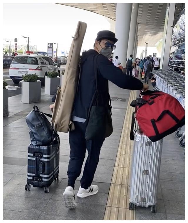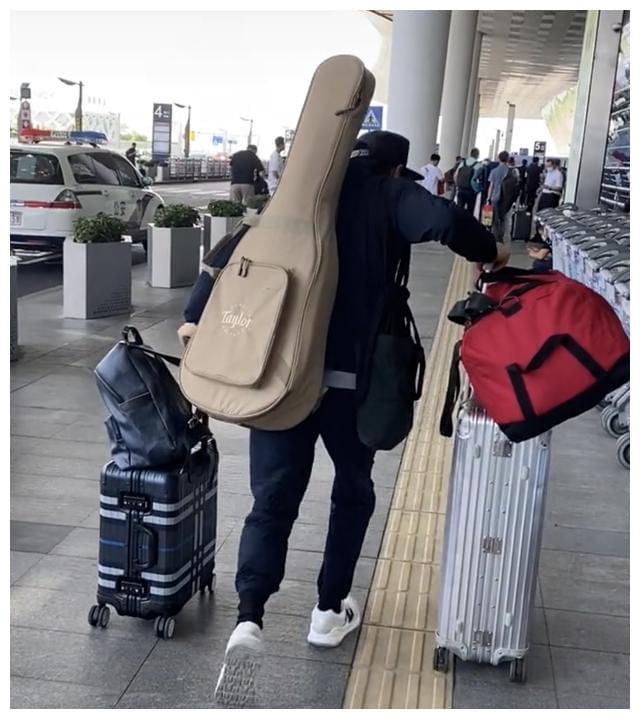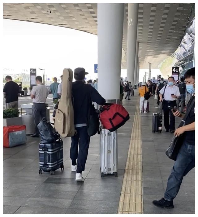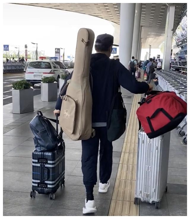 很多艺人出行时会带上助理或保镖,不过谭耀文却完全没有明星架子。他独自一人拿着两个行李箱、两包物品,身上还背着一把吉他、一个黑色的单肩包。满满当当六大包行李,给人一种沉甸甸的感觉。