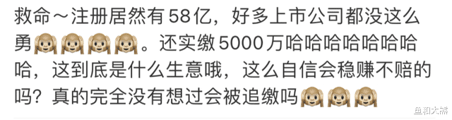根据资料显示,虽然注册公司是以实际缴纳金额为准,但注册资本也是不可以乱填的,这个资金代表着如此公司破产,经营人需要赔付的金额,敢下58亿的天价,可见对经营充满了信心。因此,即便实际缴纳资金为5千万,网友也是大呼震惊。