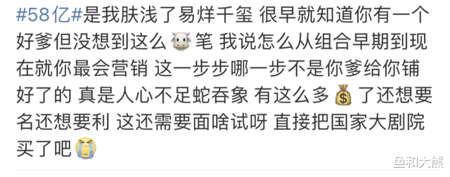 而随着事件持续发酵,网友的关注点逐渐从58亿转到了易烊千玺父亲的人脉上,开始否定易烊千玺的一切。